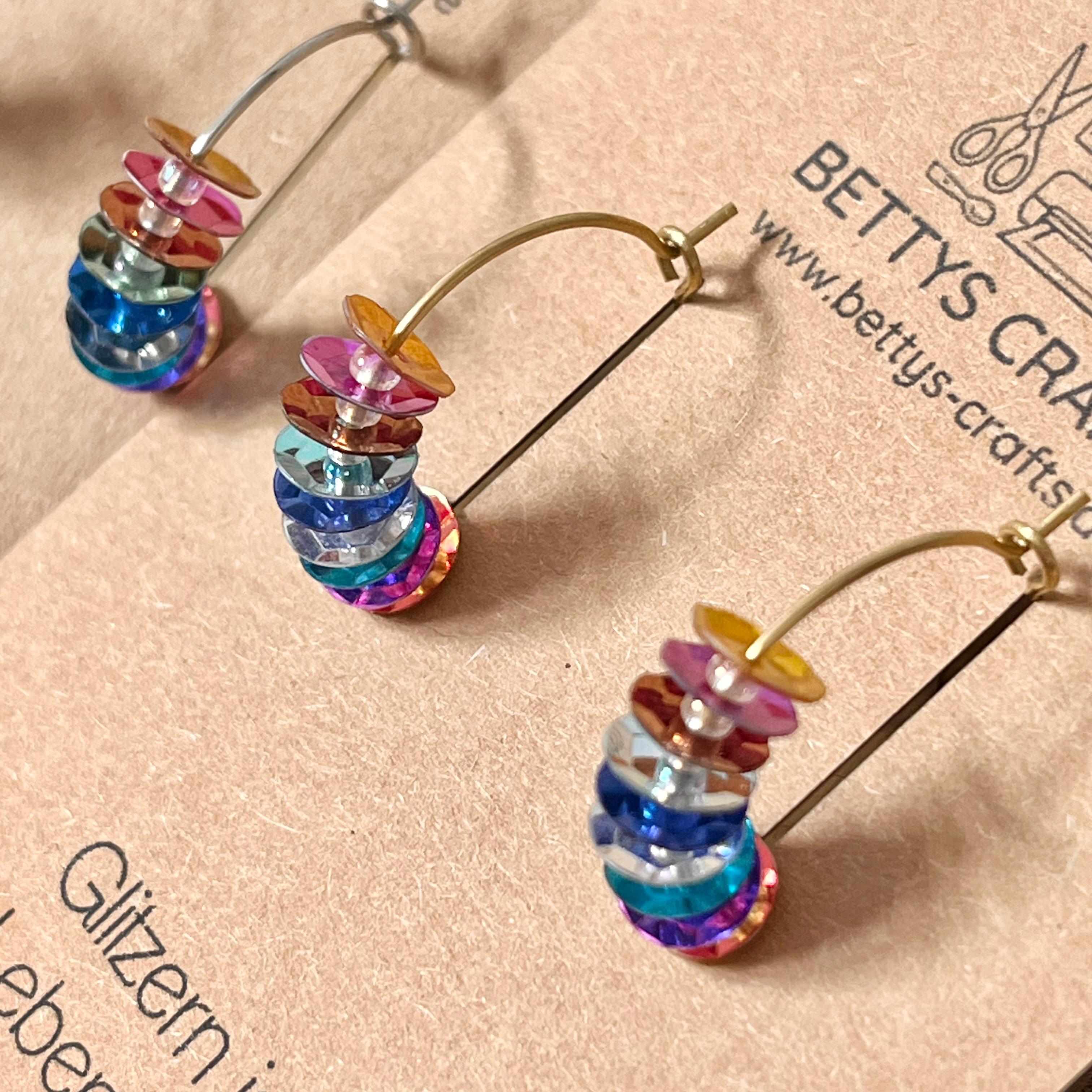 Genau dieser Moment hat die Idee für meine neuen Ohrringe geboren. Ich liebe es, wenn Farben und Materialien einfach zusammenfinden – ganz spontan, ohne Plan, nur aus dem Bauch heraus. Und so entstanden farbenfrohe Creolen, die funkeln, klimpern und einfach gute Laune machen.